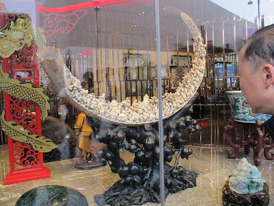 我們下榻的飯店位在九龍半島,從九龍去港島的交通方式有:港鐵、巴士、渡輪,前面兩項我們都搭過了,所以今天就來點不一樣的渡輪吧~這邊要搭渡輪要從維多利亞港坐船,所以我們就第三度來到維港啦!沿途有經過一家位在維港前方的藝品店,裡面擺設了象牙雕刻,很精緻唷!